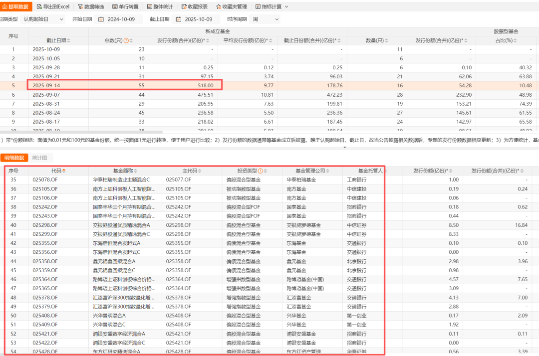 当前A股观察资金的方向,其中一个重要的指标其实是关于新的公募基金的募集资金的额方向。比如我们随便举个例子,9月14号这周市场的资金: