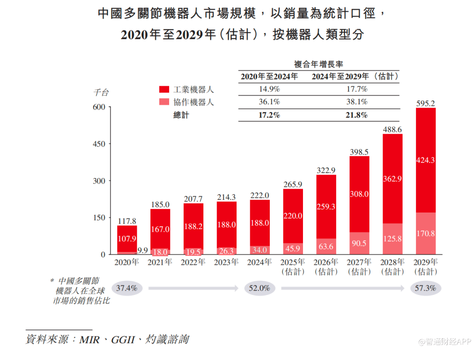 据灼识咨询报告,预计中国多关节机器人市场规模将于2029年达453亿元,2024年至2029年的复合年增长率约为15.7%。全球多关节机器人市场预计将由2024年的42.7万台增加至2029年的103.94万台,复合年增长率为19.5%。随着下游制造业智能化改造加速,以及政策对智能制造装备的持续支持,中国多关节机器人销量在全球市场的占比将由2020年的37.4%稳步提升至2029年的57.3%,中国市场的全球引领地位日益稳固。