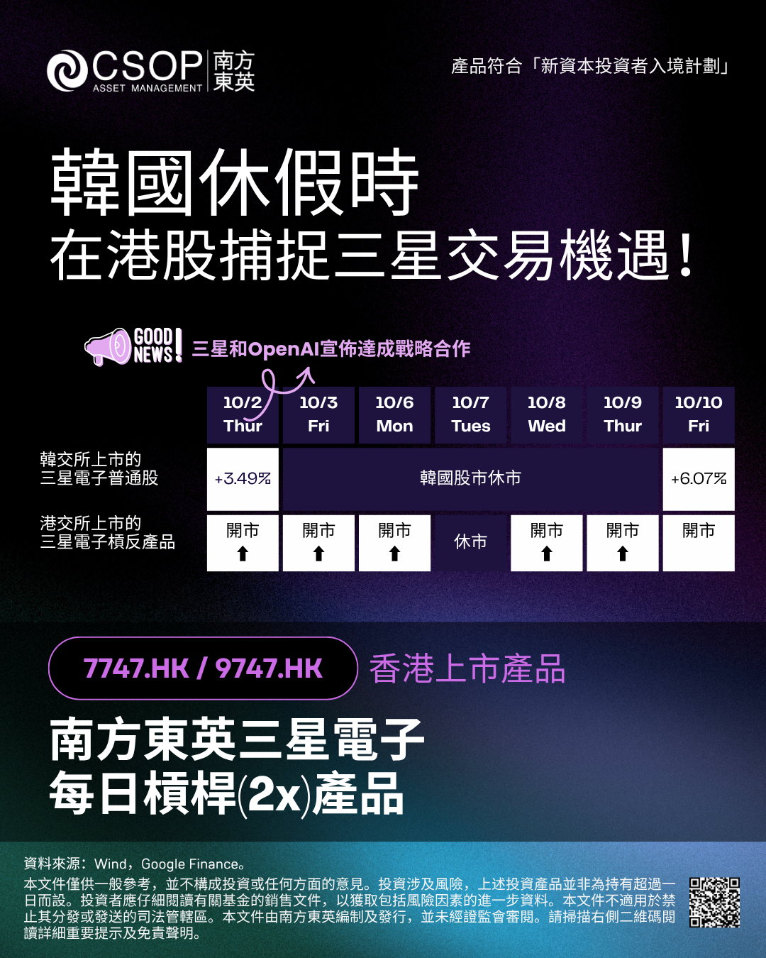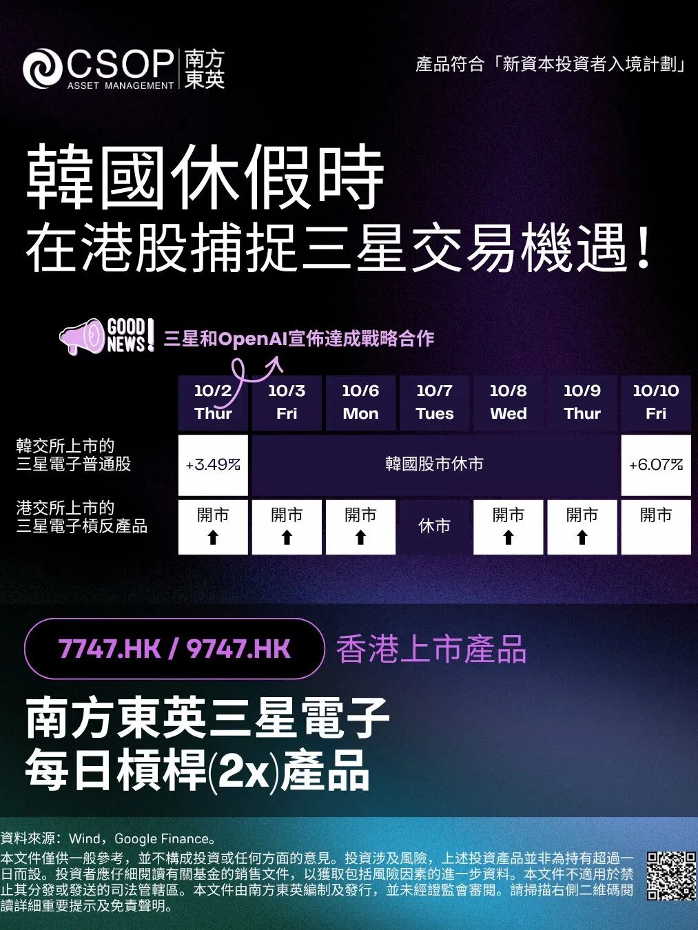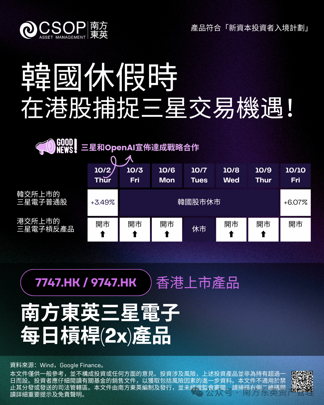10月伊始,受三星和OpenAI达成战略合作、三星接连获得大订单等乐观消息推动,三星电子股价大涨。然而随后韩国股市迎来一周长假,今日节后开市第一天收涨6.07%。韩国假日期间,香港上市的南方东英三星电子每日杠杆(2x)产品(7747.HK)如常交易,为投资者带来提前捕捉三星上涨动能的交易机会。