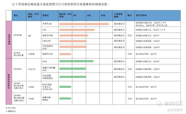 另一核心产品LP-005则展示了公司在双抗平台的创新力,作为靶向C5及C3b补体的双功能抗体融合蛋白,用于治疗阵发性睡眠性血红蛋白尿症(PNH)和补体介导肾脏疾病,已进入II期临床。早期管线LP-00A、LP-00C等也围绕双抗和补体抑制剂布局。