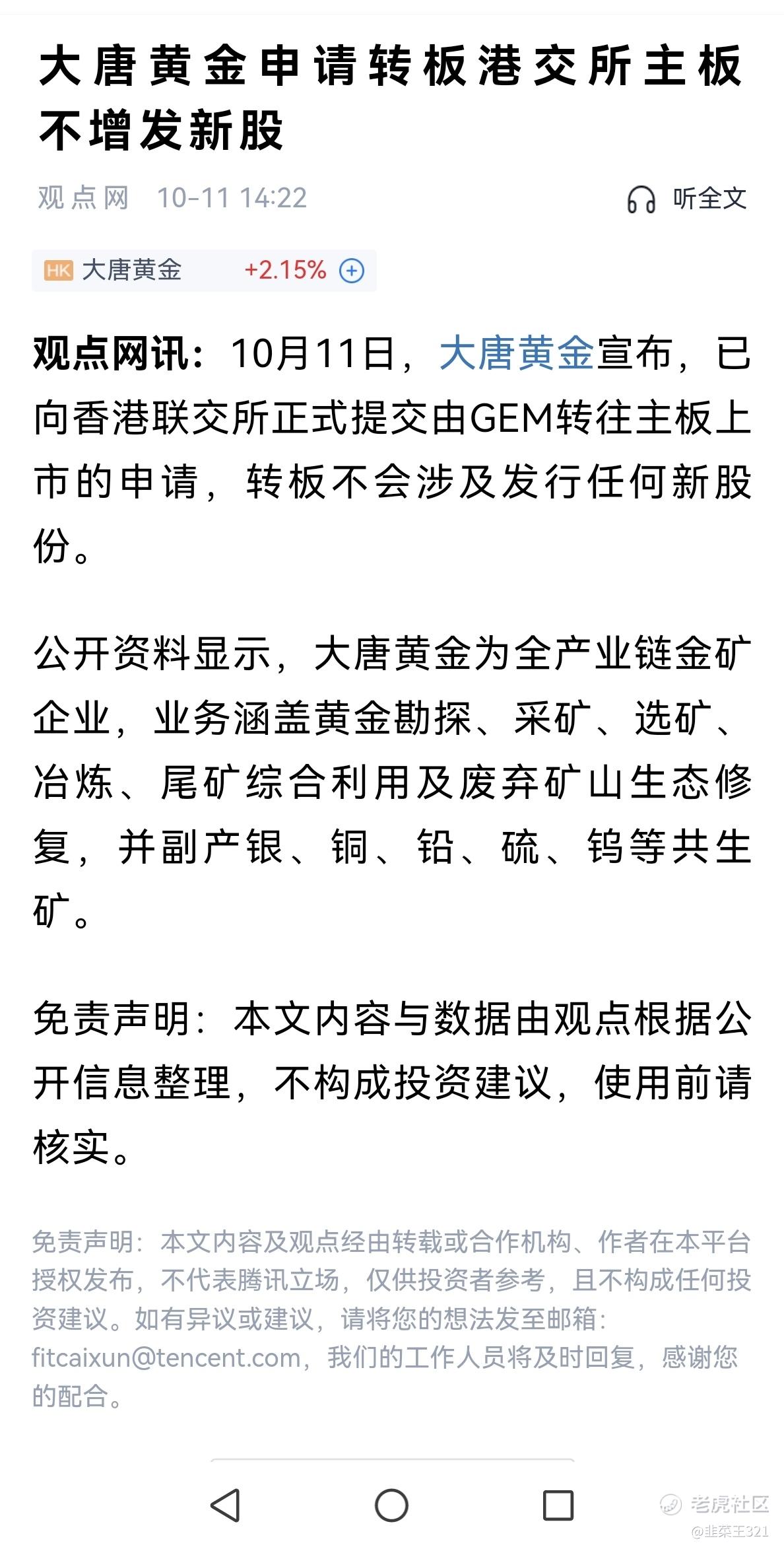 $大唐黄金(08299)$ 公司已于2025年10月10日根据主板上市规则第9B章向联交所提交转板上市申请。转板上市将不会涉及公司发行任何新股份。