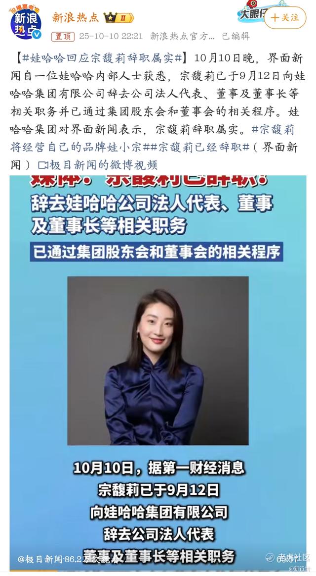 近日,娃哈哈官方确认,宗馥莉已于9月12日辞去娃哈哈集团法定代表人、董事及董事长等所有职务。