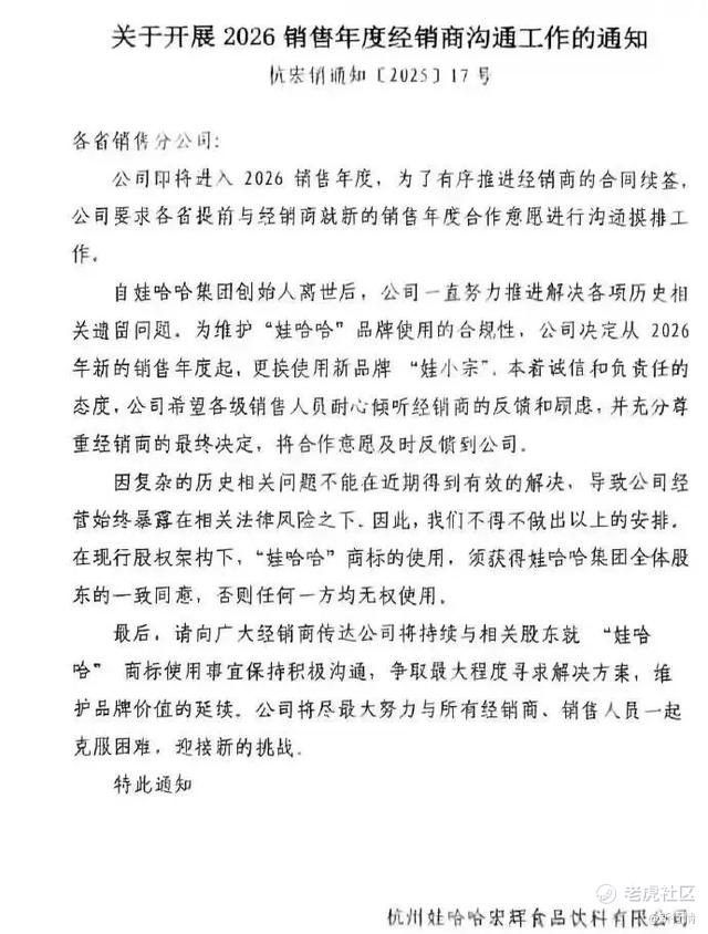 文件中提到,为维护“娃哈哈”品牌使用的合规性,公司决定从2026年新的销售年度起,更换使用新品牌“娃小宗”。