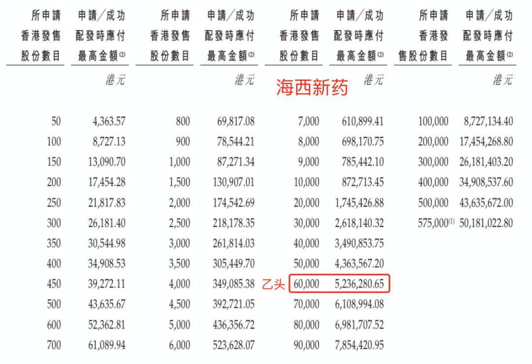 海西新药目前孖展130倍,最终大概率会超购3000倍,甲乙组各11500手。按照20万人申购算,预估一手中签率1%,甲组全部抽签。