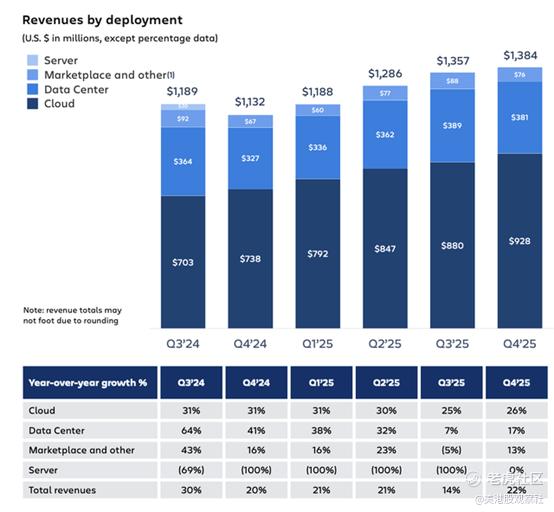 我们必须强调一个事实:尽管Atlassian今年股价持续下跌,但其增长率尚未出现任何放缓迹象。短期内,软件工程师的工作内容可能从“编写代码”转向“审核代码”(这些代码或由AI代理生成),但Atlassian并未出现华尔街所担忧的“席位数量大幅缩减”的情况。事实上,如下表所示,Atlassian核心云产品在第四季度实现了26%的同比增长,较第三季度25%的同比增速提升1个百分点(我们未考虑公司整体营收8个百分点的增速提升,因为这一数据受去年“许可证/服务器产品逐步停用”导致的业绩对比基数降低影响)。