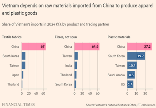 图1 越南依赖从中国进口的原材料来生产服装和塑料制品