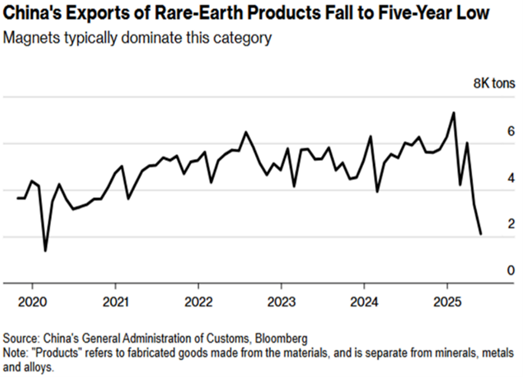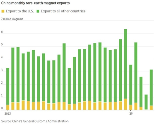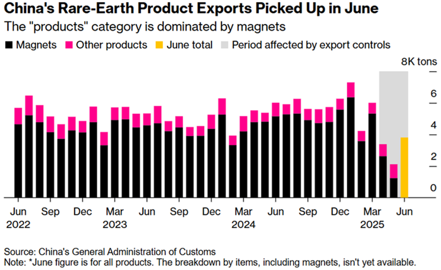 2025年6月,中美达成短暂贸易休战后,中国的稀土永磁体出口激增,约为5月的三倍,但与去年同期相比仍显著下降。