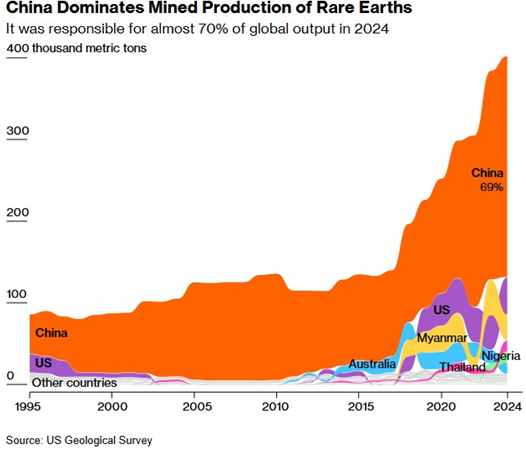 截至2024年,中国占全球稀土矿产约70%、精炼与加工约90%,并已多次利用出口控制作为政治谈判砝码(例如2010–2011年的日本、2019年与2025年的美国)。