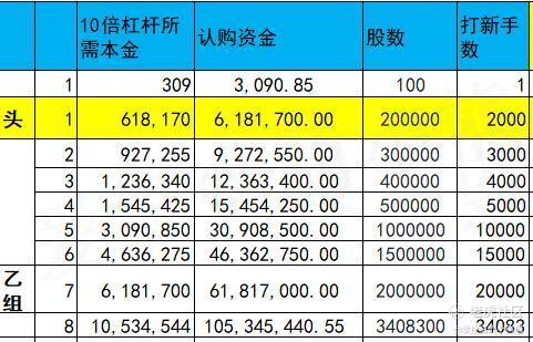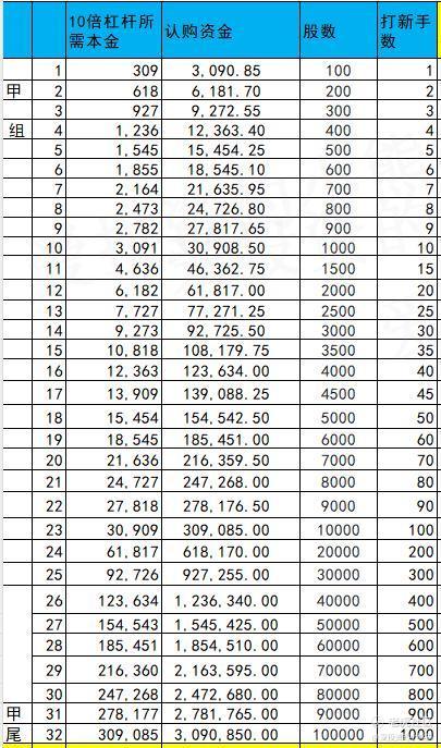 甲尾31万本金,乙头需要认购资金619万,乙组的各档融资所需要的本金还有融资金额对应如下表: