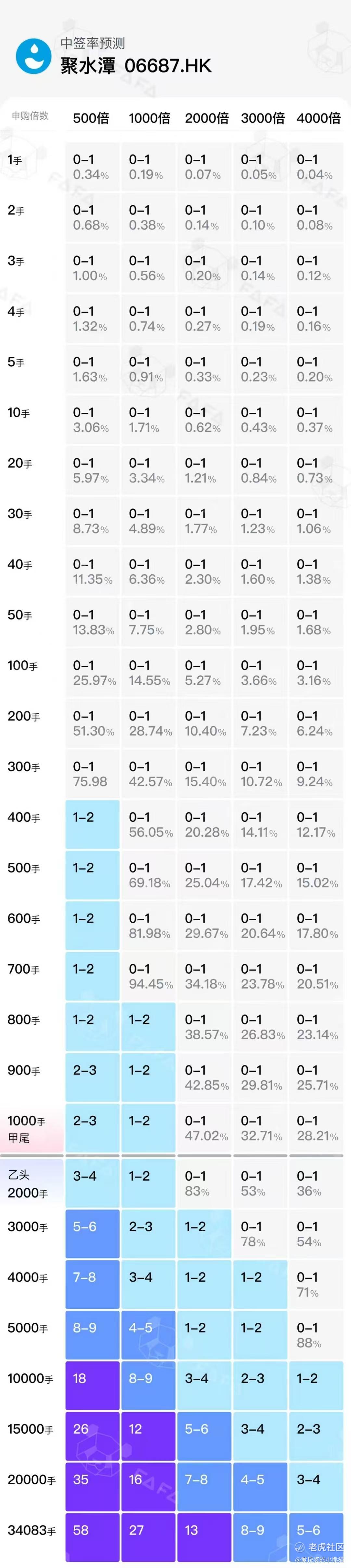 关于一手中签率方面,无论孖展多少倍,聚水潭本次公开发售仅占10%,无回拨空间,按照20万人来参与预估一下,一手中签率最好的情况也不超过10%。