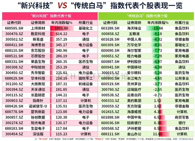 如新兴科技指数中年内涨幅TOP20的个股,涨幅都在115%以上。而传统白马股跑输市场的不在少数。