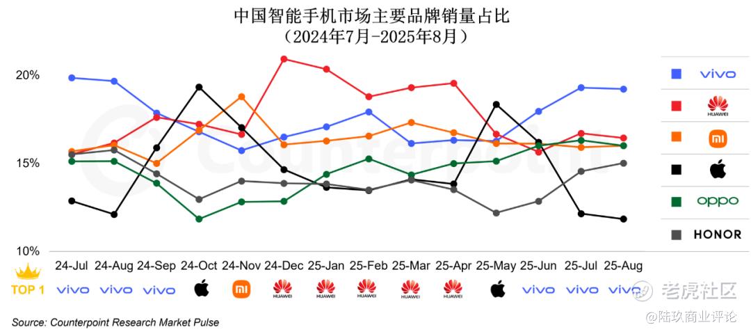 在这场突围战中,**、小米、vivo通过科技创新引领中国智能手机市场。根据Counterpoint Research Market Pulse数据,2024年7月至2025年8月,**、vivo和小米位列中国智能手机市场销量前三,占比分别为17.6%、17.6%、16.4%,合计市场份额过半。