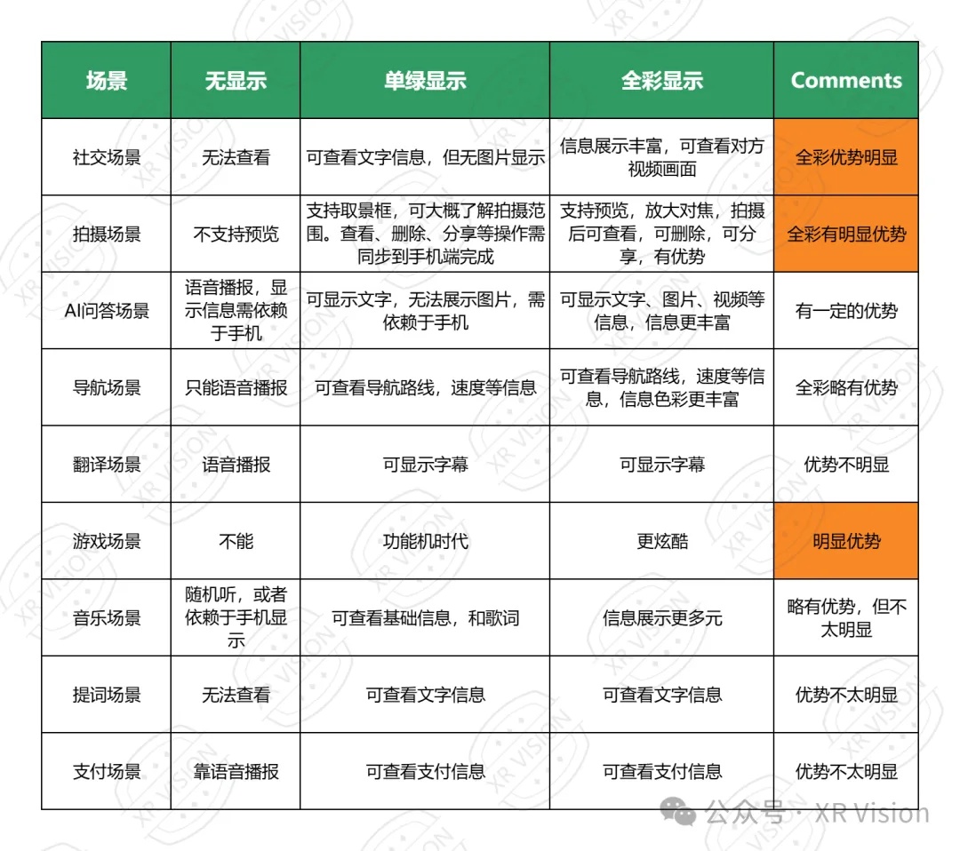 我们分析了目前显示的主要场景,可以得出下表,全彩显示在拍摄预览、社交场景、游戏场景有较为明显的优势。