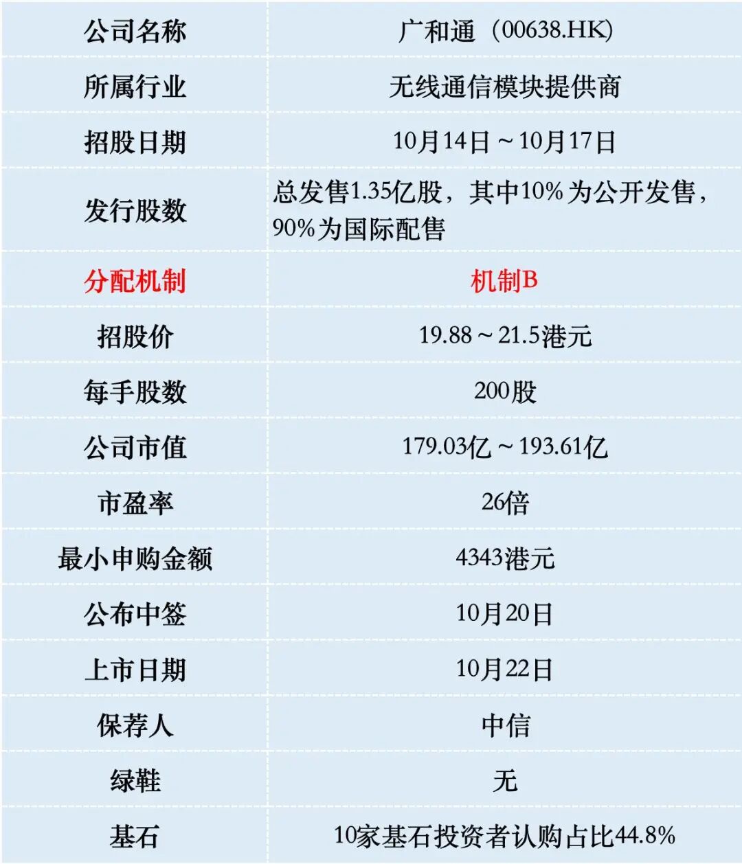 广和通本次IPO发行股份占全部股份比例的15%,按招股价上限21.5港元算,募资约29亿港元,10名基石投资者锁定12.6亿,流通盘16.4亿,这个流通盘很大。