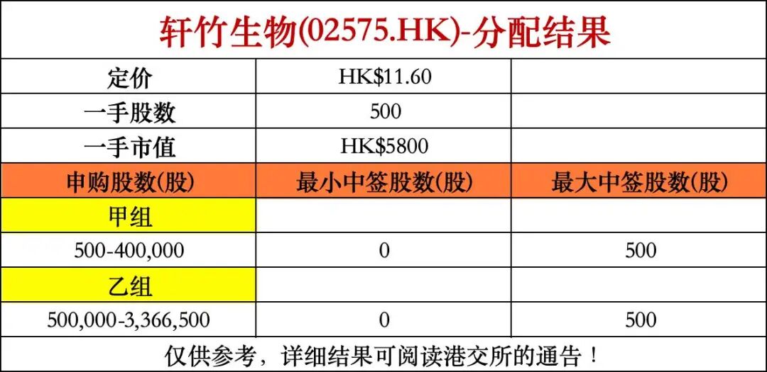 今天下午16:00后各券商陆续公布轩竹生物的中签结果,但详细信息要等明天下午暗盘交易结束后,晚上22点港交所官方网站披露易发布的新股配发结果公告。