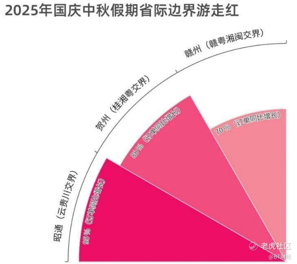 省际边界游爆发,游客可“一次性体验多省风情”一日跨三省甚至更多省的感觉极具诱惑力,云贵川交界的昭通、桂湘粤交界的贺州、赣粤湘闽交界的赣州等省际交界城市订单量同比增幅达58%-95%。