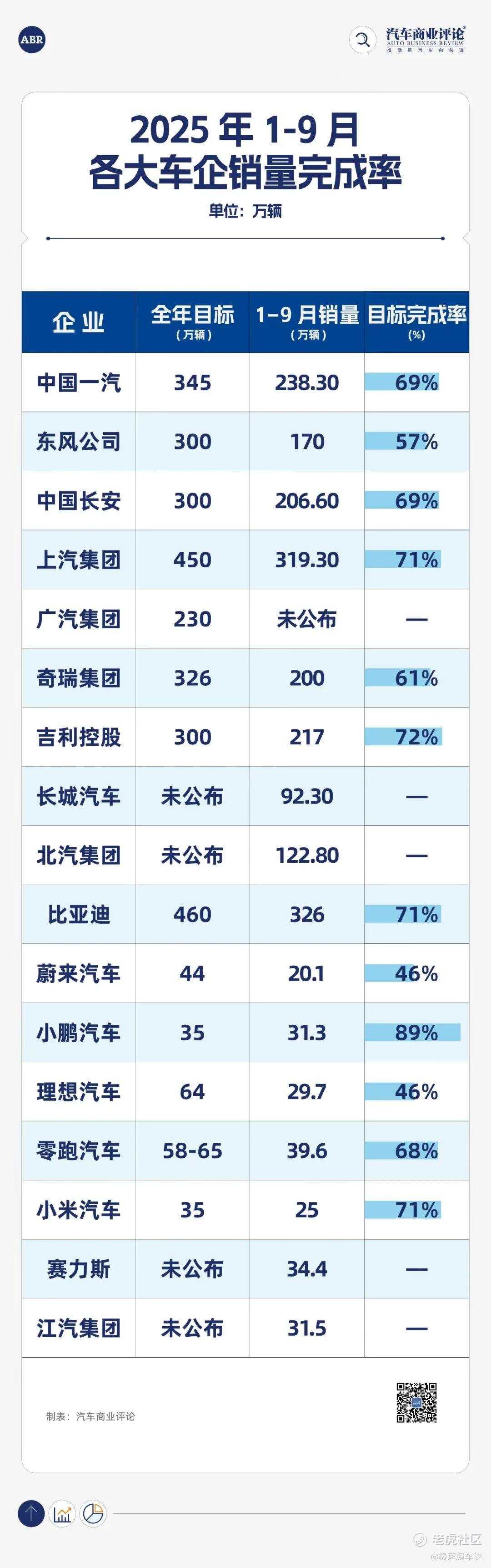 2025年四季度已至,车企年度目标冲刺进入关键期。据《汽车商业评论》数据,17家主流车企中,仅小鹏汽车前三季度销量完成率超75%,达89%,其年初保守的目标设定成关键因素。