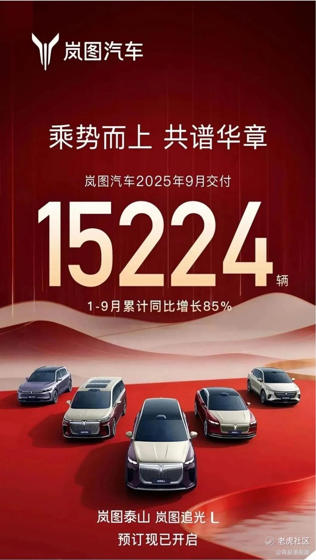 根据官方数据,2025年9月,岚图汽车单月交付达15224辆,同比增长52%;2025年1-9月,岚图汽车累计交付达96992辆,同比增长85%,连续七个月销量过万并实现“八连涨”。