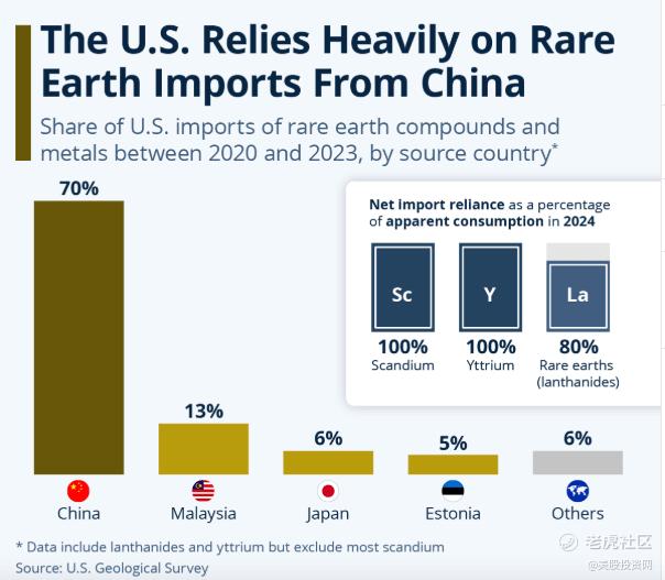 你可能觉得这是夸大其词?我们看这张图——根据美国地质调查局(USGS)的数据,2020–2023年间,美国进口的稀土中有高达70%来自中国。这意味着,美国的高科技制造几乎离不开中国的稀土。