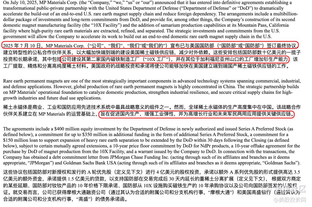 我们看好它的核心逻辑是 “政策保底”。MP 已经和国防部签下了一份长达十年的战略协议。这份合同不仅为它的核心产品——钕镨(NdPr)设定了 每公斤 110 美元的价格下限,还承诺对它未来 10X 磁体工厂的产出有优先采购权。 这意味着什么?无论市场价格怎么波动,MP 的收益都有保底、订单有保证,现金流稳定性大幅提高。它是 “稀土自主化”的绝对核心。