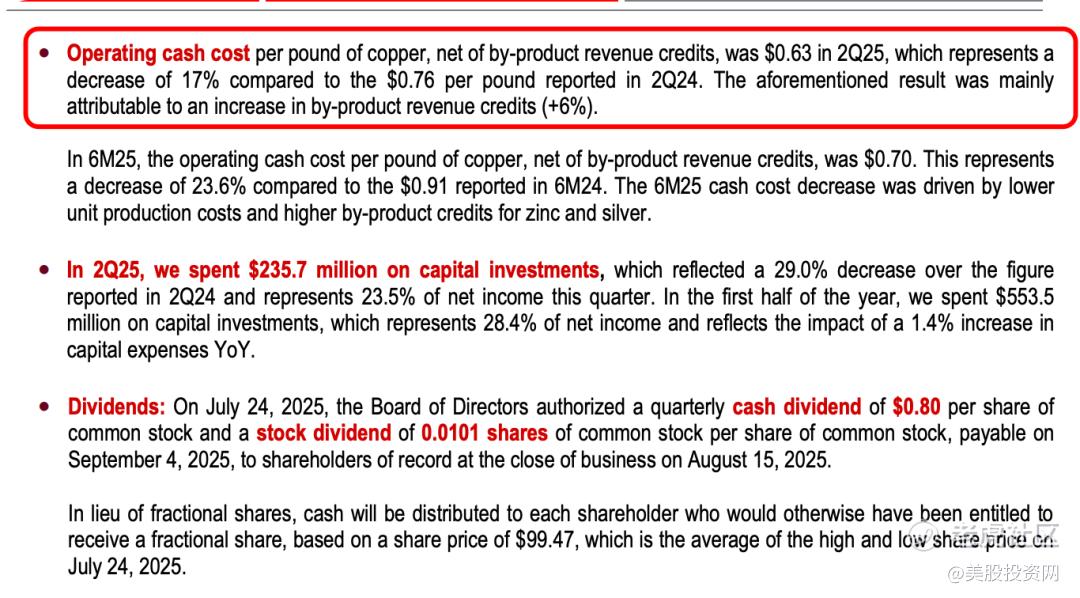 根据公司最新的2025年第二季度向SEC提交的文件显示,其合并单位净现金成本仅为$1.13/磅,大幅低于其全年指引的1.55/磅,同时远低于行业平均水平(通常在2/磅以上)。