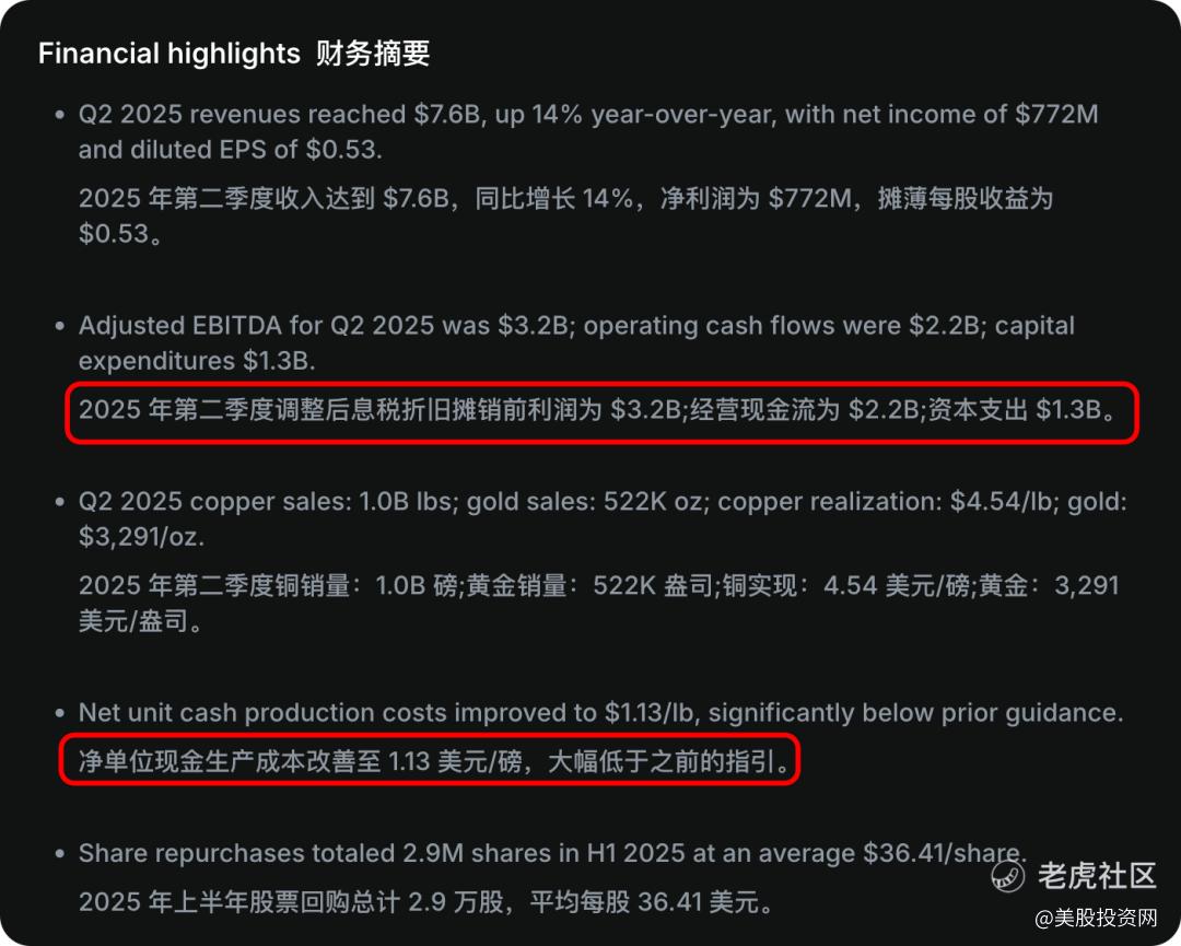 黄金副产品带来的巨大信用额度,使得FCX能在铜价下跌时依然保持强大的盈利能力。在财务表现上,FCX在2025年Q2实现了$32亿的EBITDA和高达$22亿的运营现金流,体现了其庞大的体量和现金产生能力。尽管其Q2铜产量为9.63亿磅,但公司预计2025年全年的铜销量将达到约39.5亿磅,其规模效应在全球铜企中稳居前列。