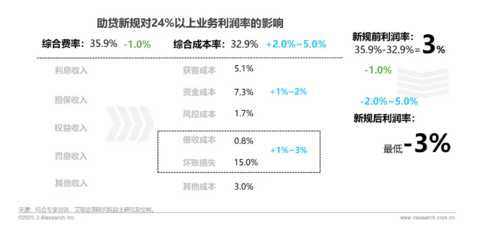 而新规后,艾瑞咨询认为24%+业务利润将降至-3%~0%。推导逻辑是,新规落地后,机构虽可通过贷款+权益/保险等方式变现做到24%+,但综合费率仍会下降1%。