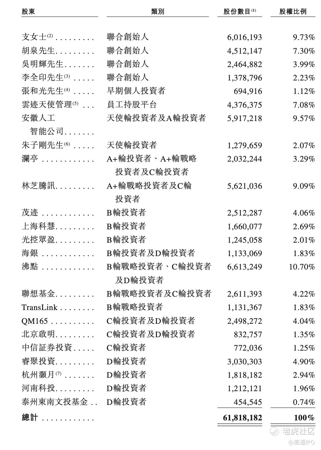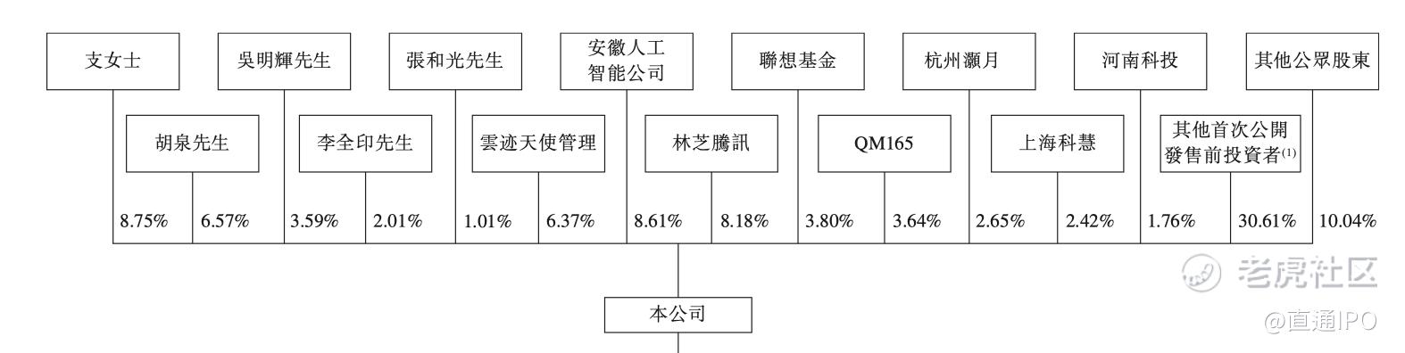 此外,沸点资本合计持股9.62%,系第一大外部股东;科大讯飞持股12.54%的安徽人工智能公司持股8.61%;林芝腾讯持股8.18%;启明创投旗下QM165持股3.64%,北京启明持股1.21%,合计持股约4.85%;联想基金持股3.80%;阿里旗下杭州灏月持股2.65%;早期个人投资者张和光持股1.01%。