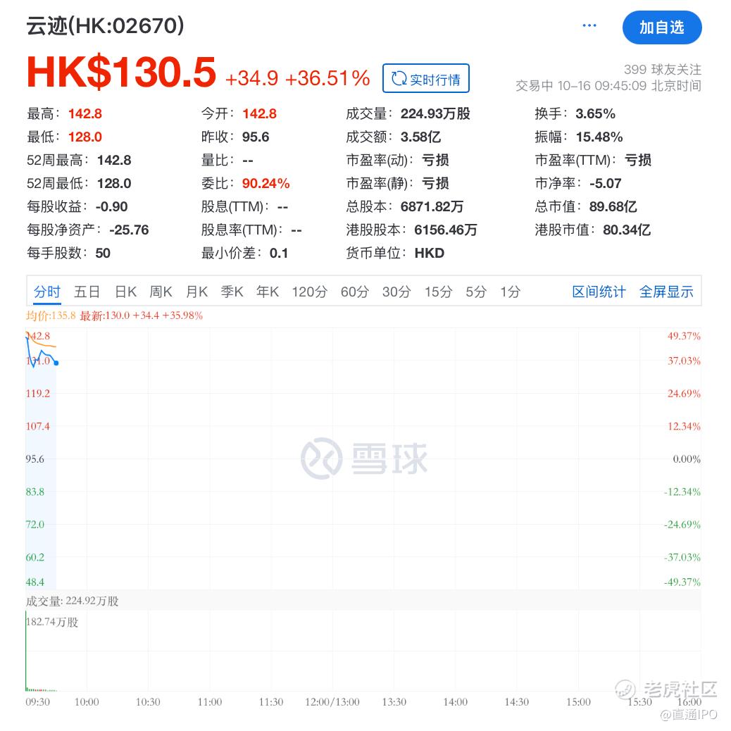 截至发稿,云迹科技涨36.51%报130.5港元,总市值89.68亿港元,港股市值80.34亿港元。