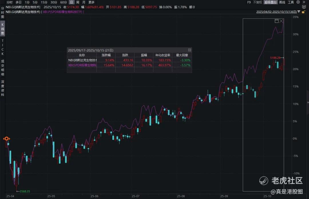 例如在美联储上个月的降息后,9月17日以来,美股XBI和NBI分别上涨15.6%、9%,欧洲和韩国的生物科技公司也有好的表现。反而,在这轮创新药大周期里基本面最强的港股创新药,在近一个月里是回调的过程,而接下来或许是港股创新药追回涨幅的机会。
