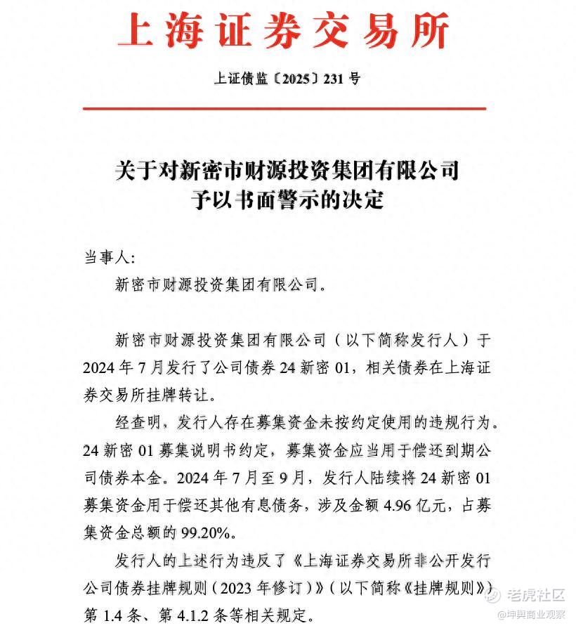 9月18日,上海证券交易所发布《关于对新密市财源投资集团有限公司予以书面警示的决定》。经查明,新密市财源投资集团有限公司(以下简称“新密财源”)存在募集资金未按约定使用的违规行为。