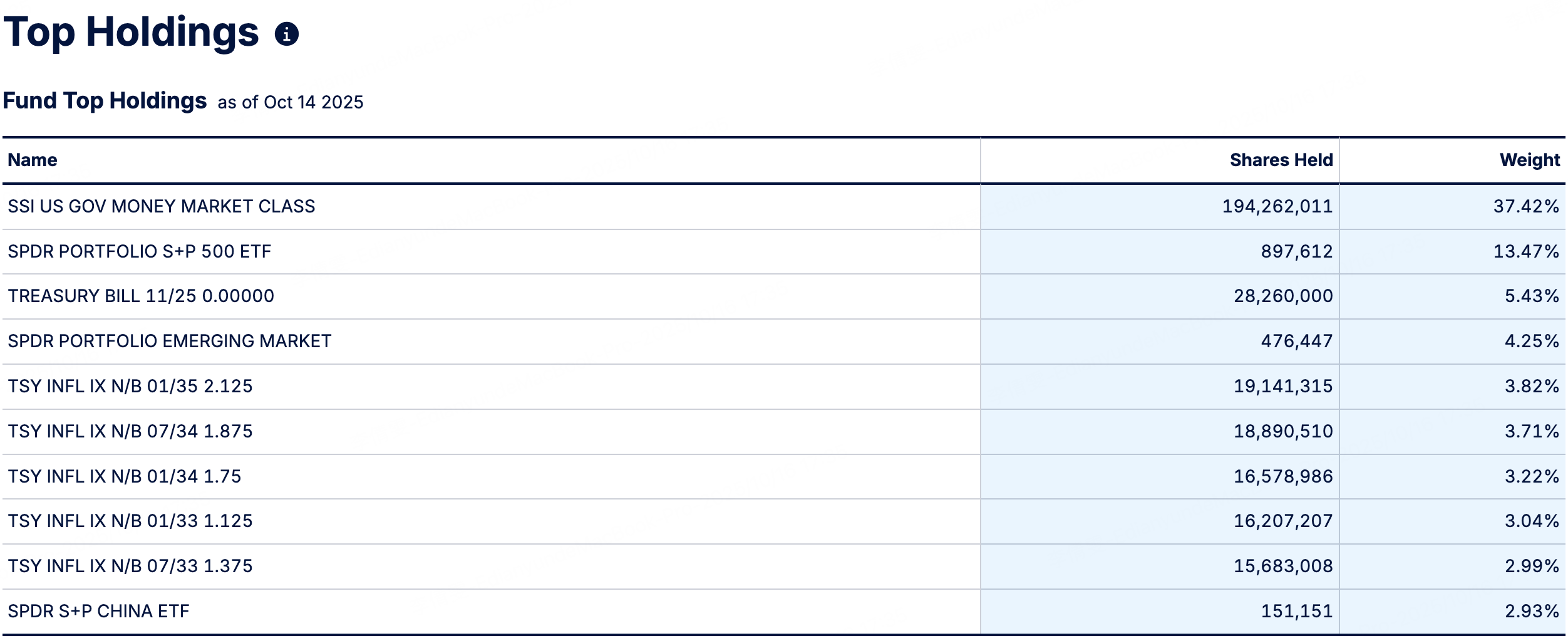 股票部分的配置则更为均衡。截至 10 月 14 日,股票合计占比 42.55%。ALLW 通过SPDR Portfolio S&P 500 ETF(13.47%)获得美国股市的核心敞口,通过SPDR Portfolio Emerging Market ETF(4.25%)覆盖新兴市场,再加上SPDR S&P China ETF(2.93%)引入中国及亚洲经济体的增长因子。这样的布局让基金能在全球增长周期中分享收益,又不至于过度依赖单一市场。
