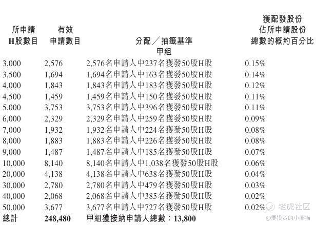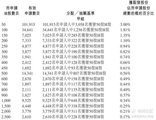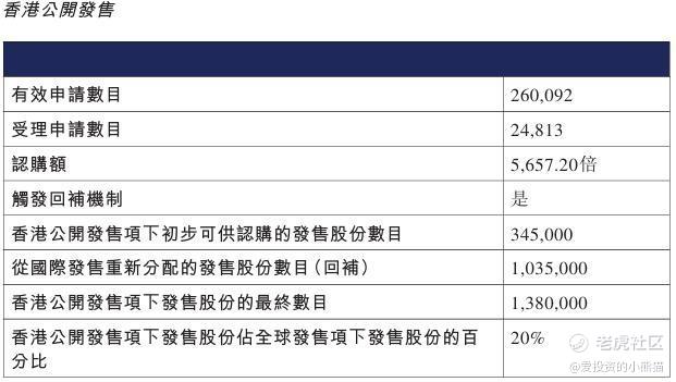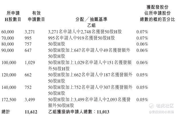 配售情况:260092人认购,这次公配5657.20倍,十分火热,由于执行分配机制A, 超过50倍回拨比率20.00%,国配有18.62倍,一手中签率3.00%,认购1600手稳中1手,同时乙组11612人申购,其中顶头槌申购3499张,获配率0.05%-0.07%。