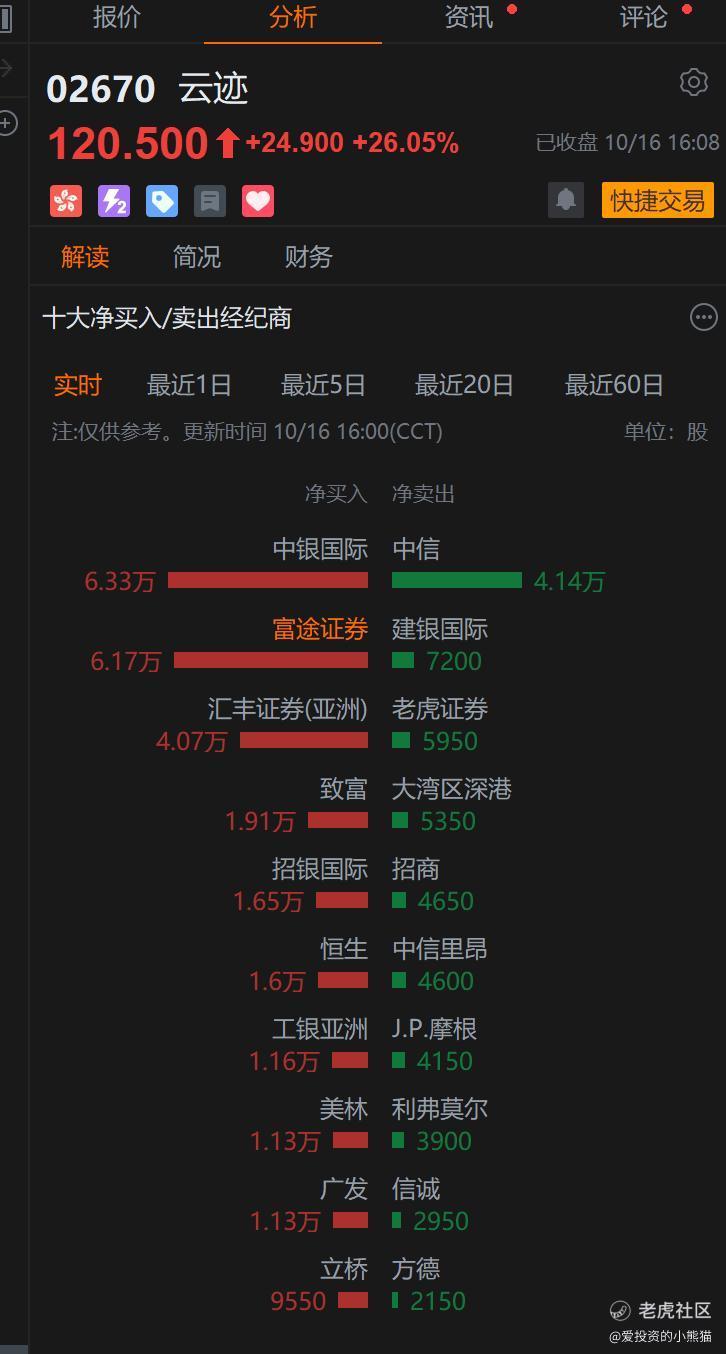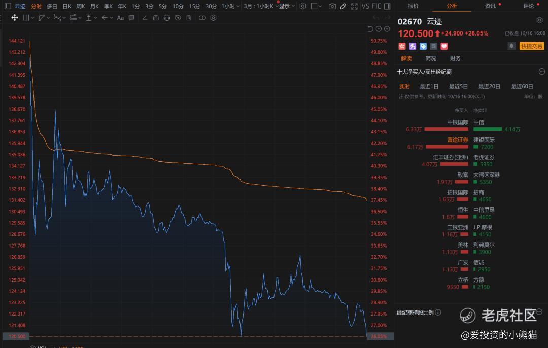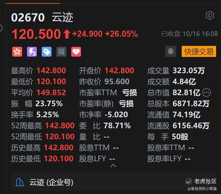 最近新股气氛冷下来了, $云迹(02670)$ 以142.8港元/股开盘,较95.6港元的发行价大幅上涨49.37%,最高触及142.8港元,最低下探120.1港元,显示出市场情绪的剧烈博弈。最终收报120.5港元,涨幅收窄至26.05%,全日成交323.04万股,成交额4.84亿港元,总市值约为83亿港元 。