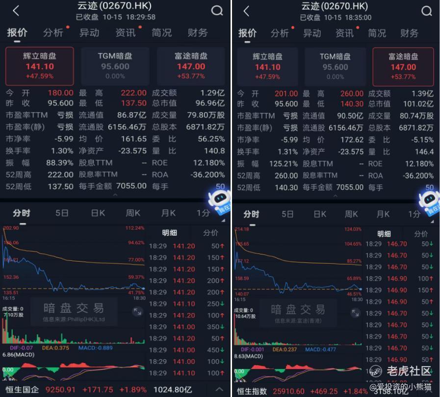 云迹(02670.HK) 辉立暗盘以180.00港元高开,秒冲到最高点222.00港元后,再回落震荡整理,最低探到137.50港元,尾盘以141.10港元报收,涨幅为47.59%,振幅88.39%,成交1.29亿港元。