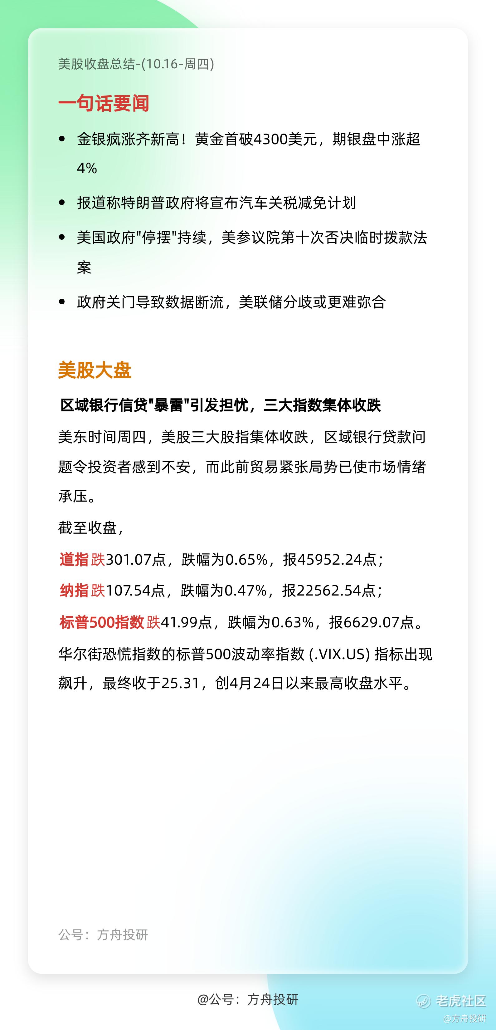 {"i18n":{"language":"zh_CN"},"detailType":1,"isChannel":false,"data":{"magic":2,"id":490047334281272,"tweetId":"490047334281272","gmtCreate":1760667824956,"gmtModify":1760668104061,"author":{"id":3574248082782203,"idStr":"3574248082782203","authorId":3574248082782203,"authorIdStr":"3574248082782203","name":"方舟投研","avatar":"https://static.tigerbbs.com/096674f9c30dc2a4600045b95ec19100","vip":1,"userType":1,"introduction":"","boolIsFan":false,"boolIsHead":false,"crmLevel":1,"crmLevelSwitch":0,"individualDisplayBadges":[],"fanSize":37,"starInvestorFlag":false},"themes":[],"images":[{"img":"https://static.tigerbbs.com/f9fc640ab659344bff0d08dbe1f8798e","width":"1590","height":"3300"},{"img":"https://static.tigerbbs.com/b075c204f034d6a75f05a3cf2d3c8187","width":"1590","height":"3300"}],"coverImages":[{"img":"https://static.tigerbbs.com/f9fc640ab659344bff0d08dbe1f8798e","width":"1590","height":"3300"}],"html":"<html><head></head><body>10 月 16 日(周四)美股\n<br>\n- 三大指数收跌,恐慌指数创 4 月来新高\n<br>\n- 美国政府\"停摆\"持续,美参议院第十次否决临时拨款法案\n<br>\n- 黄金突破 4300美元<img src=\"https://static.tigerbbs.com/f9fc640ab659344bff0d08dbe1f8798e\" tg-width=\"1590\" tg-height=\"3300\"><img src=\"https://static.tigerbbs.com/b075c204f034d6a75f05a3cf2d3c8187\" tg-width=\"1590\" tg-height=\"3300\"></body></html>","htmlText":"<html><head></head><body>10 月 16 日(周四)美股\n<br>\n- 三大指数收跌,恐慌指数创 4 月来新高\n<br>\n- 美国政府\"停摆\"持续,美参议院第十次否决临时拨款法案\n<br>\n- 黄金突破 4300美元<img src=\"https://static.tigerbbs.com/f9fc640ab659344bff0d08dbe1f8798e\" tg-width=\"1590\" tg-height=\"3300\"><img src=\"https://static.tigerbbs.com/b075c204f034d6a75f05a3cf2d3c8187\" tg-width=\"1590\" tg-height=\"3300\"></body></html>","text":"10 月 16 日(周四)美股 - 三大指数收跌,恐慌指数创 4 月来新高 - 美国政府\"停摆\"持续,美参议院第十次否决临时拨款法案 - 黄金突破 4300美元","highlighted":1,"essential":1,"paper":1,"likeSize":0,"commentSize":0,"repostSize":0,"favoriteSize":0,"link":"https://laohu8.com/post/490047334281272","repostId":0,"isVote":1,"tweetType":1,"viewCount":173,"commentLimit":10,"likeStatus":false,"favoriteStatus":false,"reportStatus":false,"symbols":[],"verified":2,"subType":0,"readableState":1,"langContent":"CN","currentLanguage":"CN","warmUpFlag":false,"orderFlag":false,"shareable":true,"causeOfNotShareable":"","featuresForAnalytics":[],"commentAndTweetFlag":false,"andRepostAutoSelectedFlag":false,"upFlag":false,"length":118,"optionInvolvedFlag":false,"xxTargetLangEnum":"ZH_CN"},"commentList":[],"isCommentEnd":true,"isTiger":false,"isWeiXinMini":false,"url":"/m/post/490047334281272"}