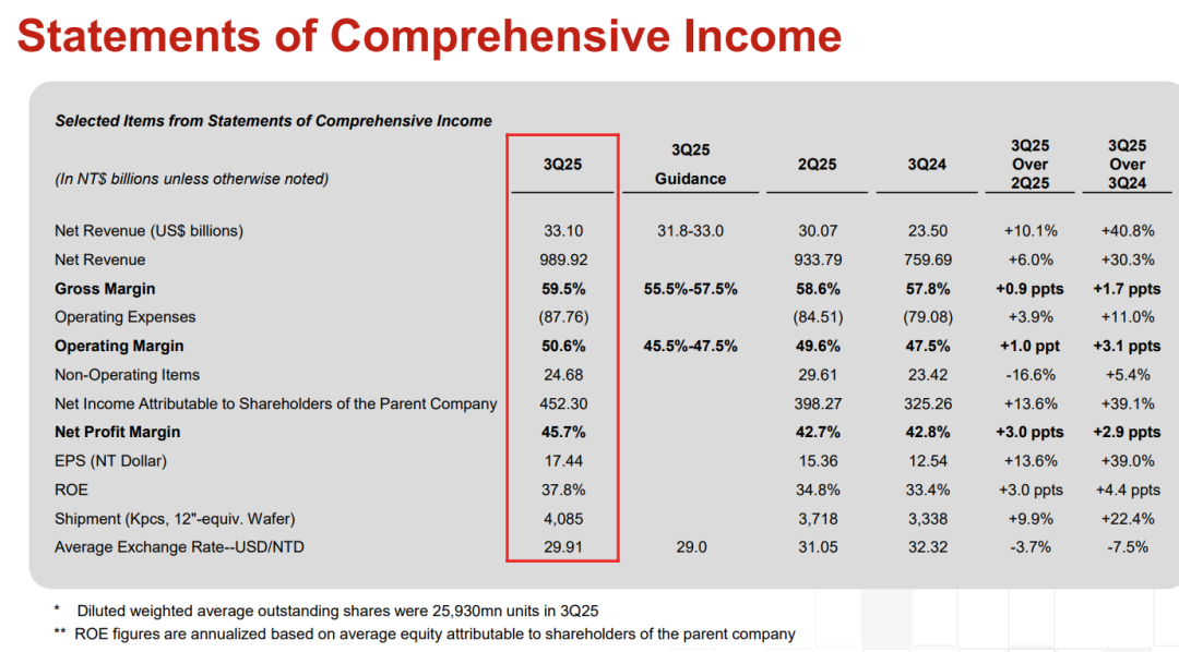 毛利率59.5%,高于预期的57%,环比提升超1pct,扛住了新台币升值和关税等不利影响;净利率45.69%,环比提升近3pct,为历史最高;