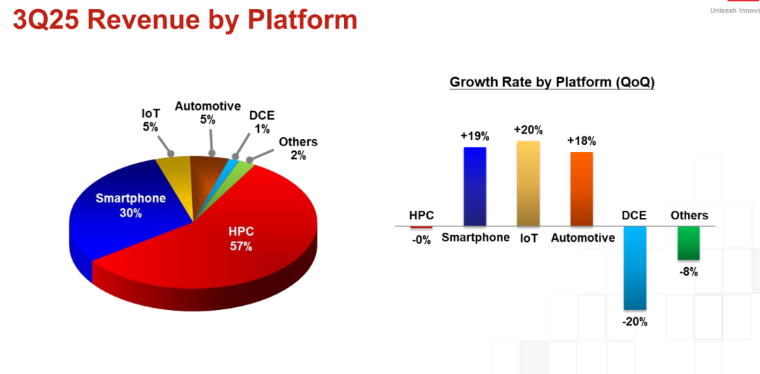 各个平台业务情况:高性能计算HPC占比57%,智能手机30%,二者占比87%,持平第而季度;与上一季度相比,HPC收入环比持平,智能手机环比增19%,显示智能手机出货拉动高端制程,AI芯片势头放缓。