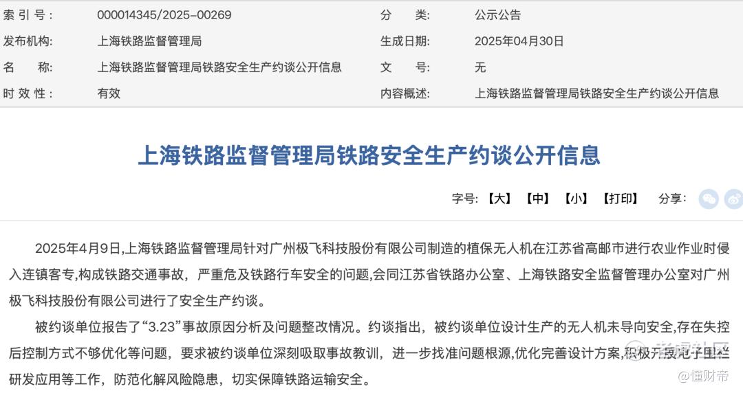 上海铁路监督管理局约谈极飞科技,指出,其设计生产的无人机未导向安全,缺失电子围栏功能,存在失控后控制方式不够优化等问题。
