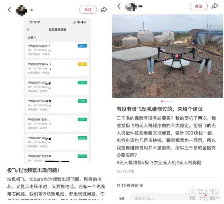 值得注意的是,在社交平台上,也有用户吐槽极飞科技农业无人机的质量。