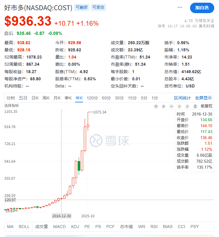 我同样认为,当前costco的投资价值其实并没有那么高了。一些我们会员内部讲的标的的赔率其实远远高于costco了。曾经的可口可乐也出现过50倍的市盈率,后来股价盘整了几年。曾经的贵州茅台也出现过50倍市盈率,结果2022年至今,股价一直在回调。