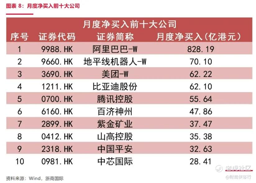 再看月度净流入量前十的个股,除了阿里巴巴,还有地平线机器人、美团、腾讯、中芯国际等多只AI科技相关的个股。