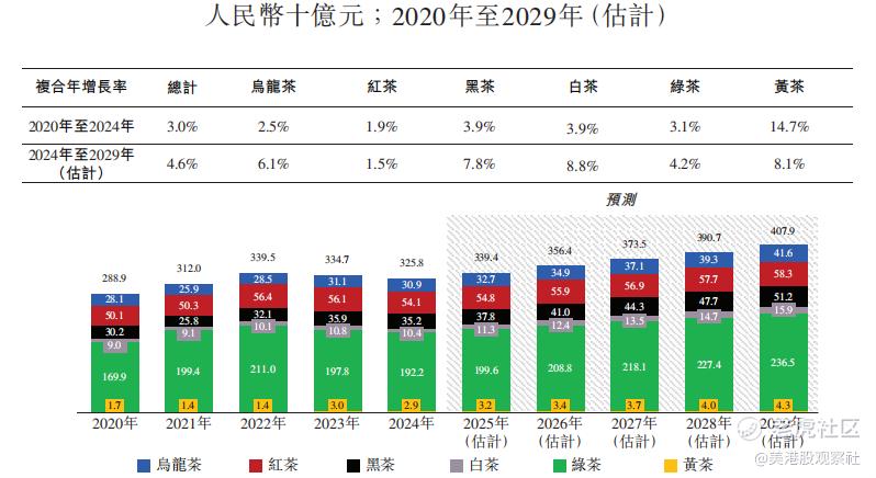 中国茶叶市场正处于稳步增长阶段,行业规模持续扩容。根据弗若斯特沙利文资料,按销售收入计算,中国茶叶市场规模从2020年的2889亿元增长至2024年的3258亿元,复合年增长率为3.0%;受益于消费升级与健康意识提升,预计2024年至2029年市场规模将以4.6%的更快增速增长,2029年达到4079亿元。从品类结构来看,黑茶、白茶及黄茶等特色茶类增速显著高于其他品类,成为行业增长的重要动力;从价格维度来看,高端茶市场增速快于中低端市场,主要因居民可支配收入提高推动消费向品质化、高端化升级,为专注高端领域的茶企提供了广阔的市场空间。此外,茶叶消费场景不断拓展,从传统礼品消费、家庭消费向日常办公、休闲社交等场景延伸,叠加线上渠道的快速渗透,进一步打开了行业增长潜力。