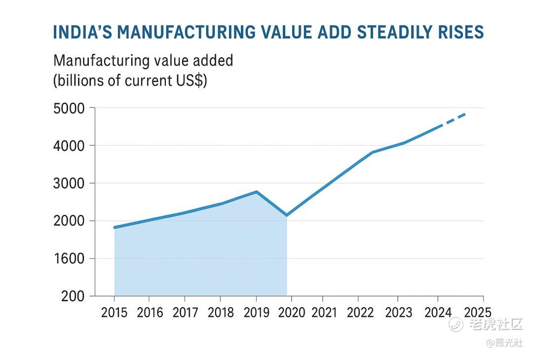 印度的经济仍以服务业与消费为主,制造业的增长虽快,却未能撬动整体结构性转型。数据上看,纵观数据,印度制造业的产出在增长、投资在扩大、出口在上升,但“制造业占GDP比重”这一指标,却在过去十年始终徘徊在15%至16%之间。