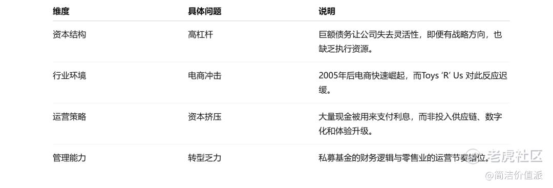 玩具反斗城的错误是:电商在整个业务中所占比重比我们当时认为的大,当时它看起来占比较小,但会成为行业更大的部分。还有糟糕的管理、门店太多、产品差。