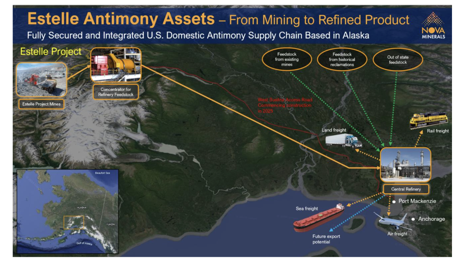 填补缺口:美国当前锑对外依赖度高(中国是全球主要锑供应国),且缺乏本土精炼产能;Nova项目通过美国国防部资金支持与本土化选址(阿拉斯加),目标打造“从采矿到精炼”的全链条本土锑供应链,直接服务于美国国防与工业需求(如军工级锑产品)。
