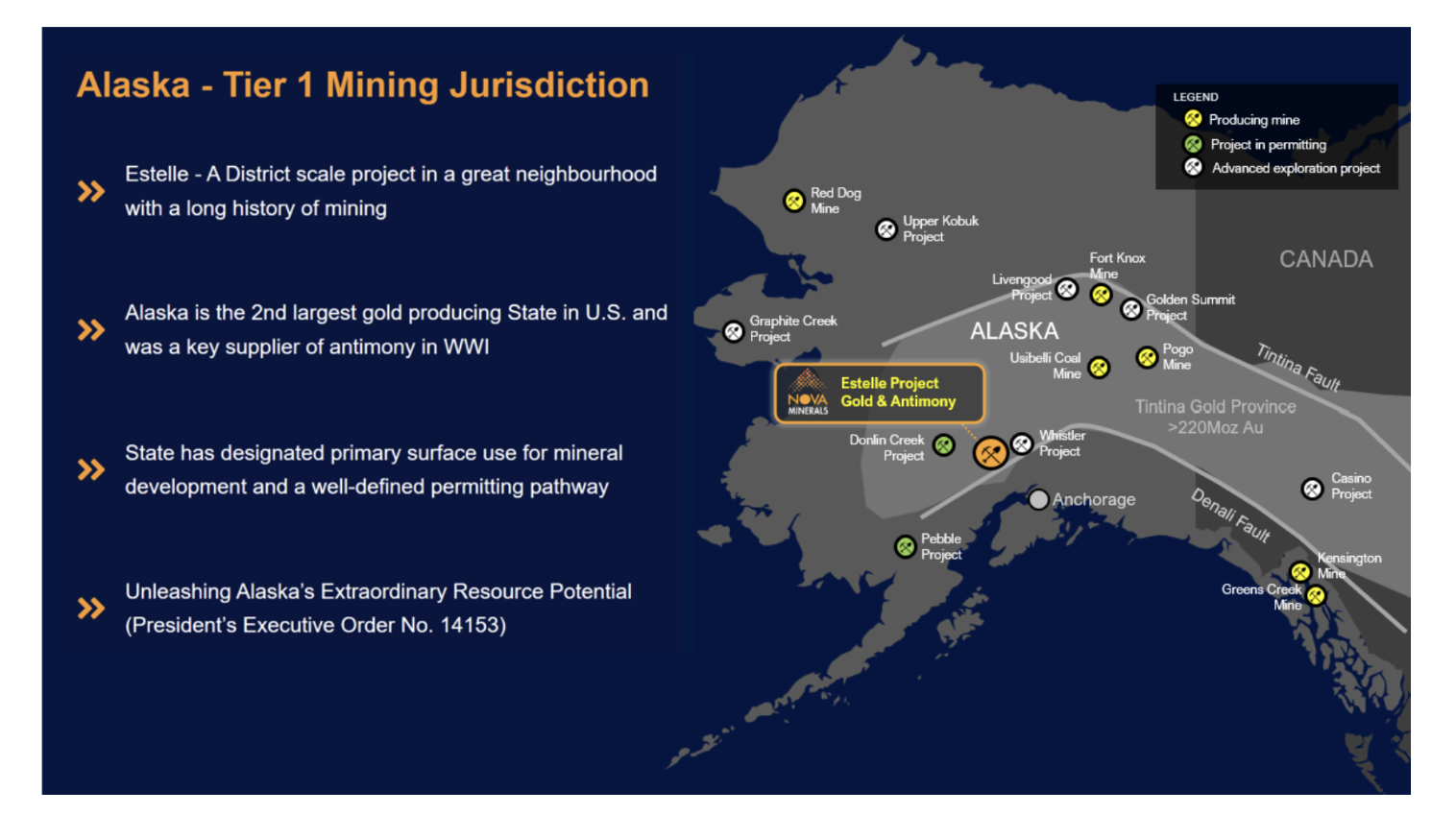 战略背景:锑(Antimony)被美国内政部列为2025年关键矿产草案清单核心品种,是国防(弹药、半导体)、能源系统及高科技产业的刚需材料;黄金则是全球公认的避险资产与高价值商品。Nova的Estelle项目同时涵盖这两种战略资源,且位于美国阿拉斯加——美国第二大产金州、一战时期重要锑供应地,兼具历史意义与现实价值。