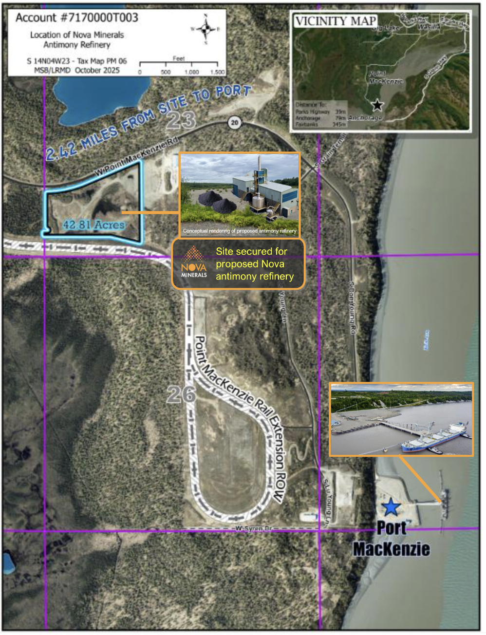 产能规划:计划在Port MacKenzie港口附近建设锑精炼厂(已获批42.81英亩/约17.3万平方米用地),目标生产锑三硫化物(Sb₂S₃)、锑三氧化物(Sb₂O₃)及金属锑,供应军事与工业双领域;项目配套建设中央选矿厂(Concentrator),原料来源包括现有矿山、历史复垦地及州外矿石,运输网络覆盖陆运(卡车)、铁路、海运(货船),未来具备出口潜力。