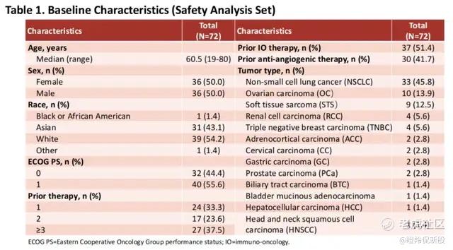 试验入组的72位患者中,既往接受过IO治疗的患者高达51.4%,既往接受抗血管生成治疗的患者比例41.7%,几乎100%符合免疫检查点抑制剂/抗血管生成疗法条件的患者在入组前都接受过相应治疗。