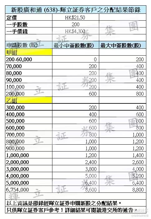 广和通 $广和通(00638)$ 今天下午公布了中签结果,很好中,我中了一手。350手稳中,又是甲尾比乙头中签率高很多的一只: